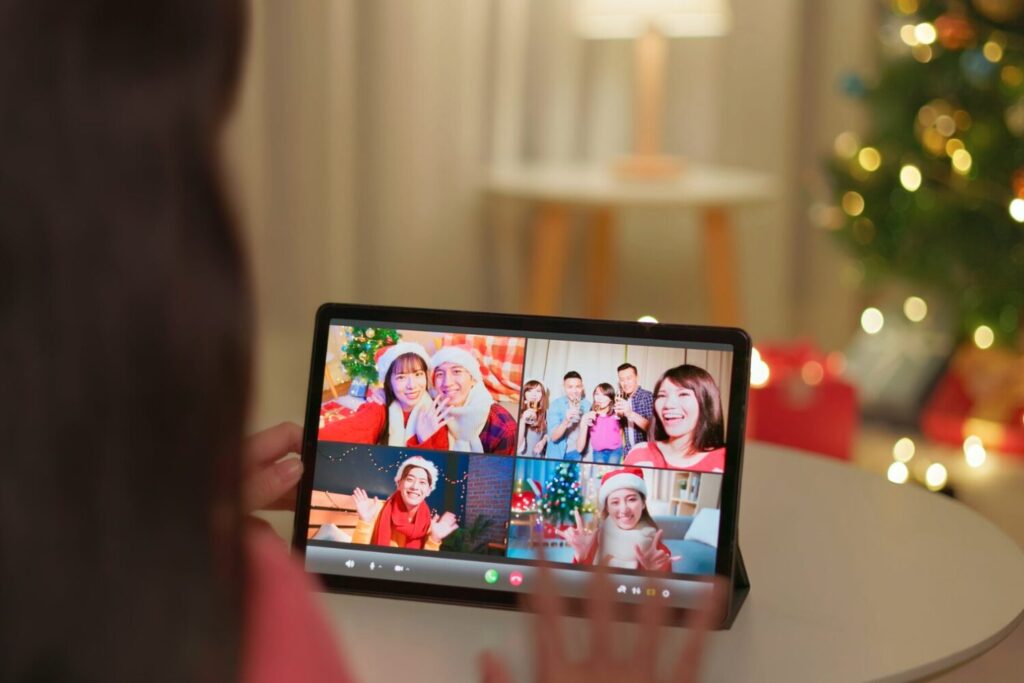 Organisez une soirée virtuelle festive via Zoom ou FaceTime. Tout le monde en pyjama de Noël ! Partagez un toast, lisez un conte ou chantez ensemble. Choisissez une heure commune et préparez la même recette ou le même cocktail pour recréer la sensation d’être réunies, même à distance.