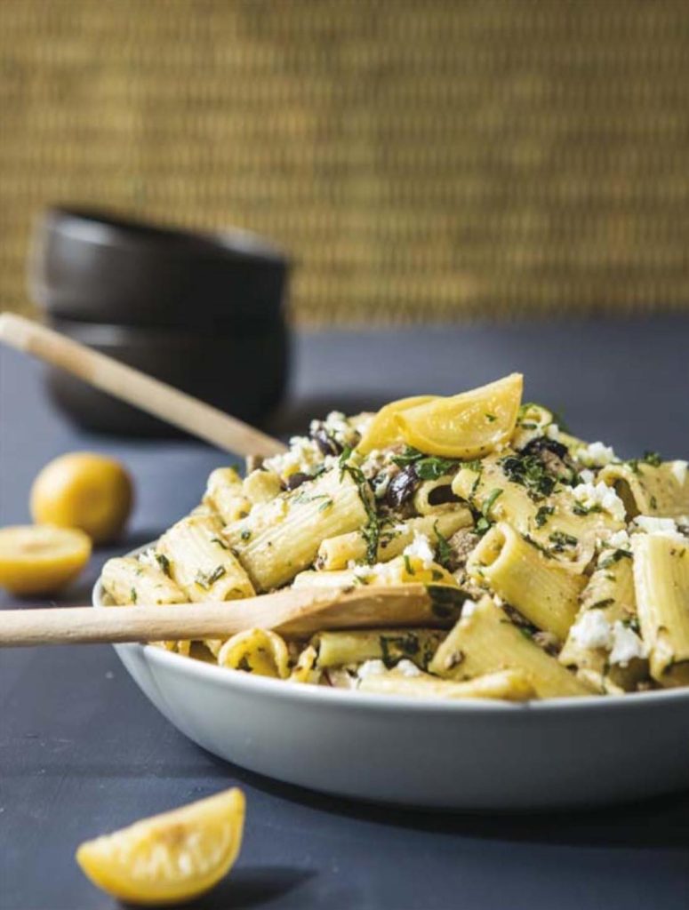 Rigatonis aux merguez grillées, au citron confit et à la feta