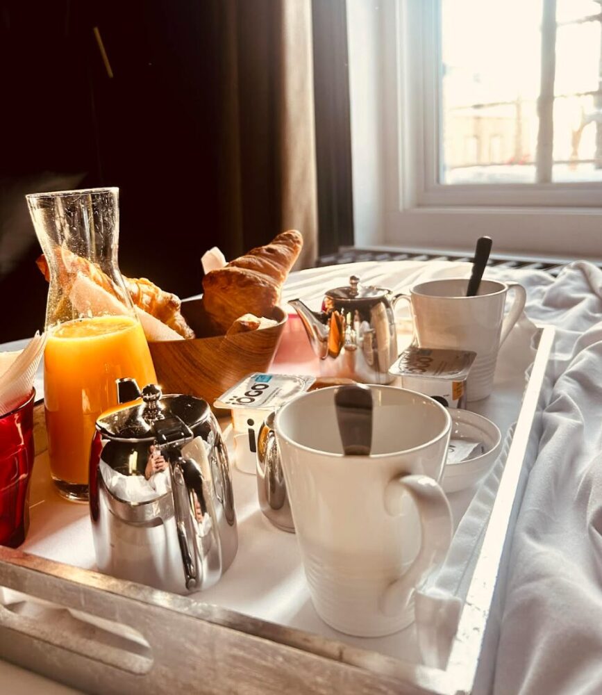 Chaque matin, le petit-déjeuner devient un moment privilégié. On peut le savourer au lit, dans l’intimité de sa chambre, ou dans le lumineux salon, baigné de lumière. Une façon douce et élégante de commencer la journée.