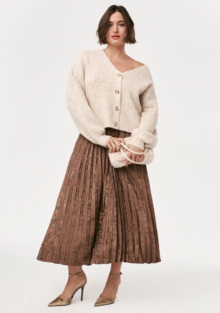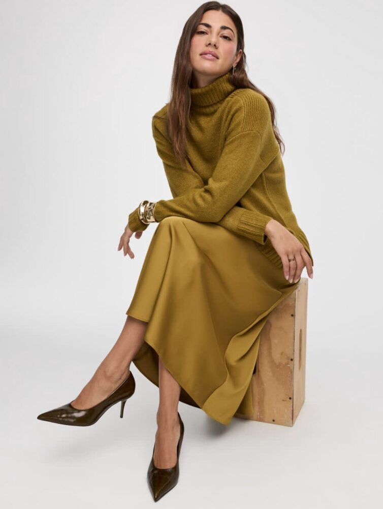 Pour un look des Fêtes élégant et confortable, le duo chandail ou chemisier avec jupe est un choix parfait. Un chandail en cachemire ou en laine fine associé à une jupe midi plissée ou en velours crée un équilibre entre confort et sophistication.