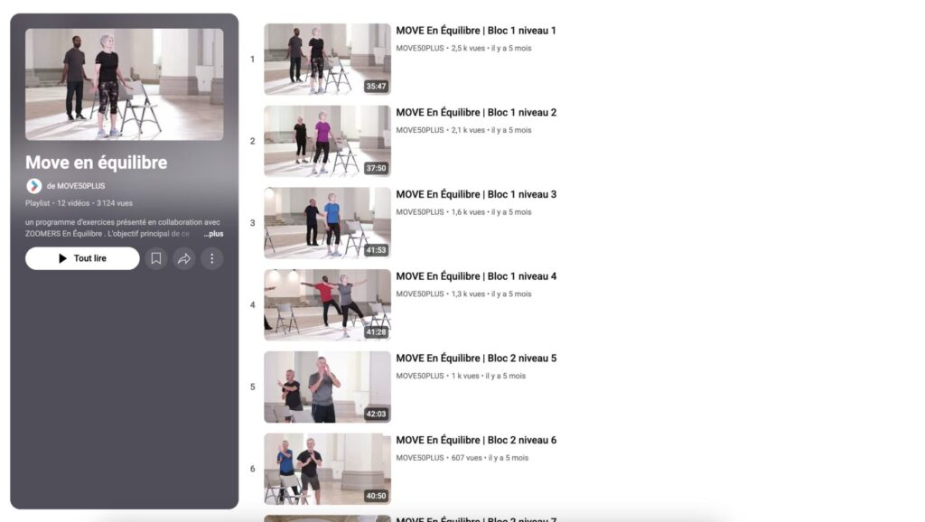 Le programme MOVE en équilibre de MOVE50plus est créé spécialement à cet effet, et met l’équilibre au défi de manière graduelle et sécuritaire. Vous pouvez choisir parmi 3 blocs d’intensité de 4 niveaux chacun. Cette progression facilite ainsi la maîtrise est exercices clés et permet à tous d’adonner au programme, peu importe sa condition physique initiale. Ce programme a été créé en collaboration avec l’équipe de recherche en prévention des chutes de l’Université du Nouveau-Brunswick et de la Chaire de recherche pour un vieillissement actif de l’Université de Sherbrooke.
