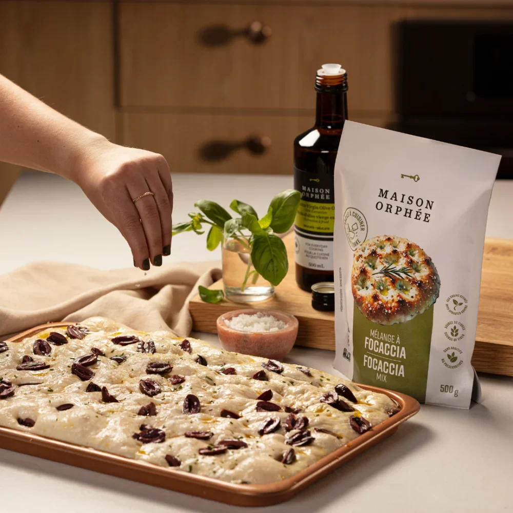 Pour débuter, l’idée d’un pain maison ou d’un accompagnement réconfortant fait souvent son effet. Le Mélange à focaccia de Maison Orphée est tout indiqué. Préparé à partir d’une base de farine enrichie à des grains germés (seigle, blé, sarrasin, quinoa, orge), il se transforme en une focaccia moelleuse et savoureuse en quelques gestes!
