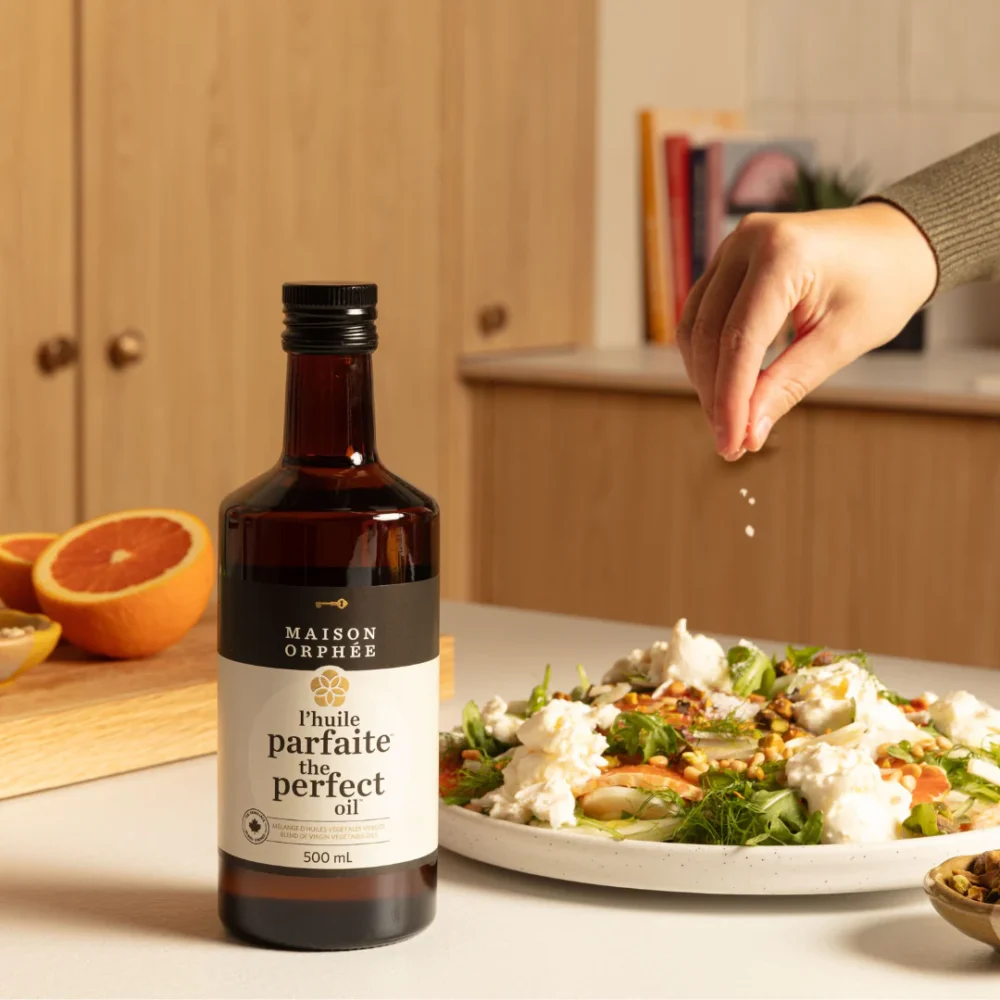 Ce mélange unique de Maison Orphée combine huiles de tournesol bio, sésame bio, canola bio, olive vierge extra et lin bio et a une saveur douce, presque beurrée, ce qui permet de l’utiliser dans tous nos plats, inspirés de toutes les cuisines du monde!