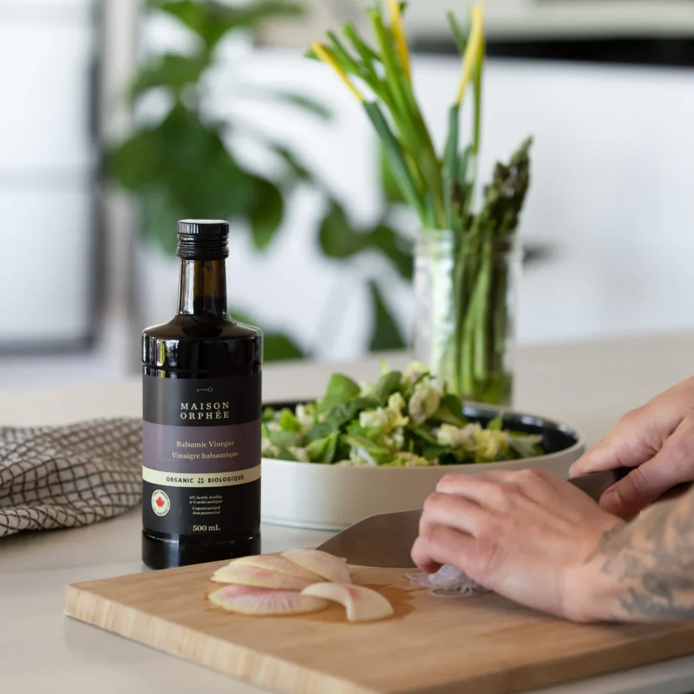 Pour peaufiner votre menu ou bien offrir un petit cadeau gourmand à vos invités, le Vinaigre balsamique biologique de Maison Orphée est une fort belle option. Vieilli trois ans en fûts de chêne, non pasteurisé, on y détecte des notes boisées, sucrées et un goût acidulé équilibré. Utilisez‑le pour ajouter un filet sur un fromage ou même une touche surprise sur le dessert. L’élégance même!